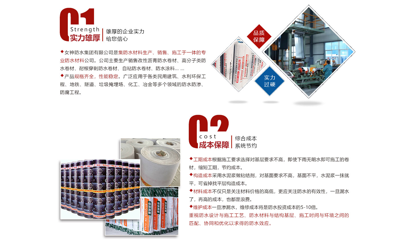安徽女神建材科技集團有限公司是集防水材料研發(fā)、生產、銷售、施工為一體的綜合性防水材料集團公司。我公司旗下有多條大型一次成型生產線:SBS改性瀝青防水卷材,DTM聚酯復合高分子防水卷材,非瀝青基高分子防水卷材,PVC,TPO高分子防水卷材等生產線。我公司秉承“創(chuàng)新發(fā)展、實惠用戶”為宗旨,確保生產材料基礎上推出“共享生產廠家”,為開發(fā)商、建筑商節(jié)約成本為理念,新理念受到用戶企業(yè)集采時一致好評和認可。在互聯(lián)網(wǎng)時代,我公司將以互聯(lián)網(wǎng)“共享”為發(fā)展理念,為開發(fā)商、建筑商、防水企業(yè)提供的產品,真正讓用戶企業(yè)達到巨大...